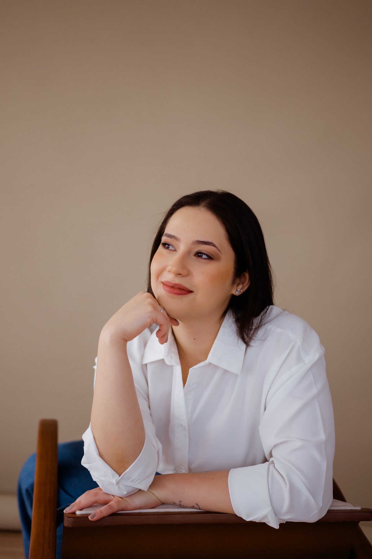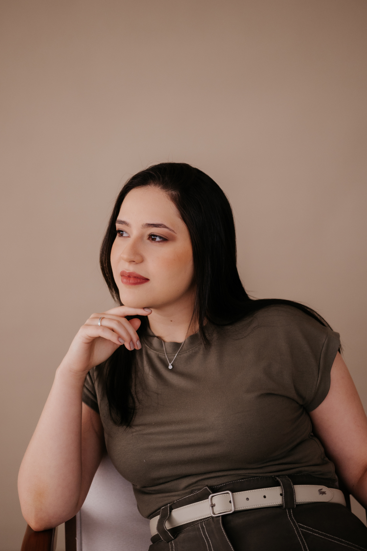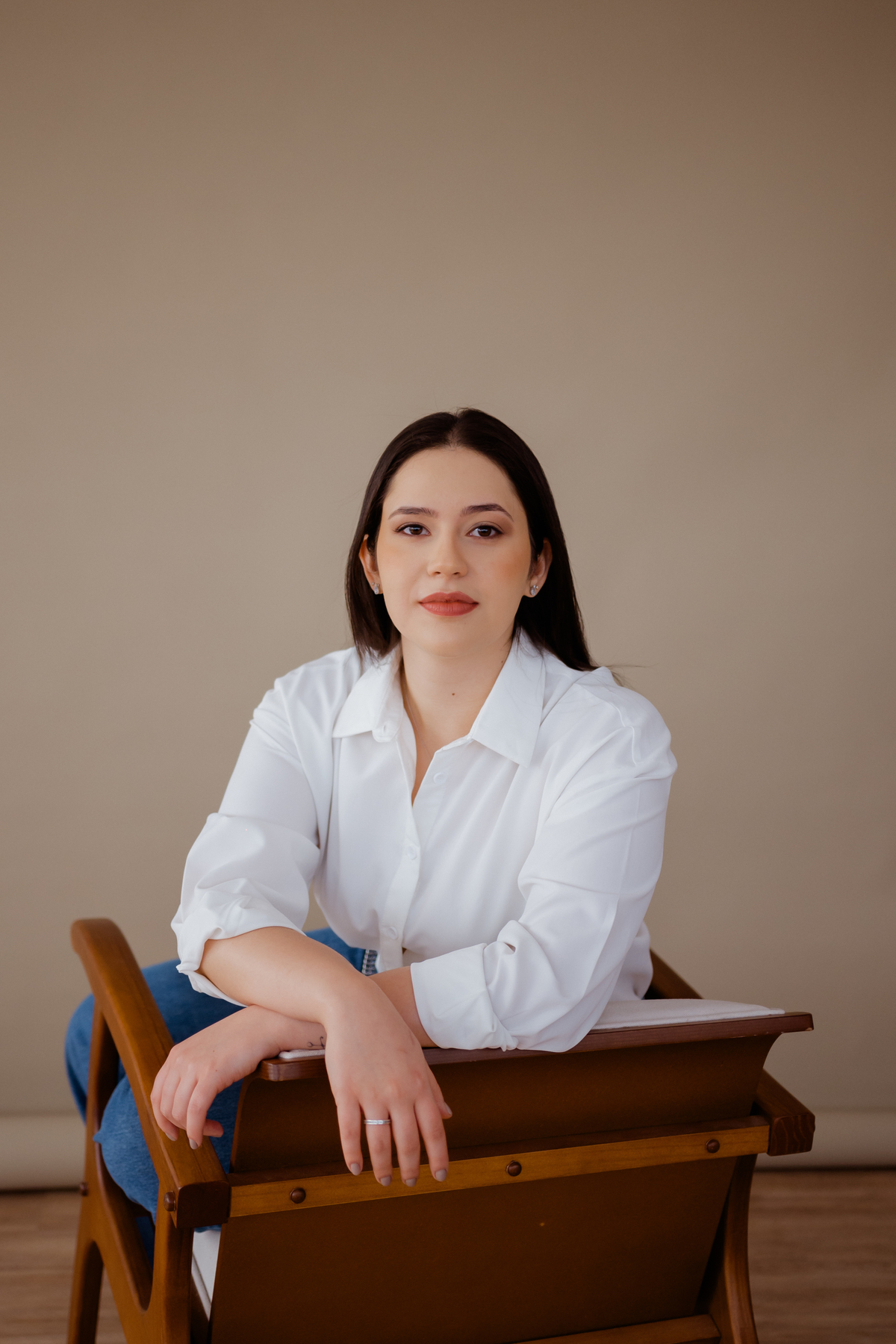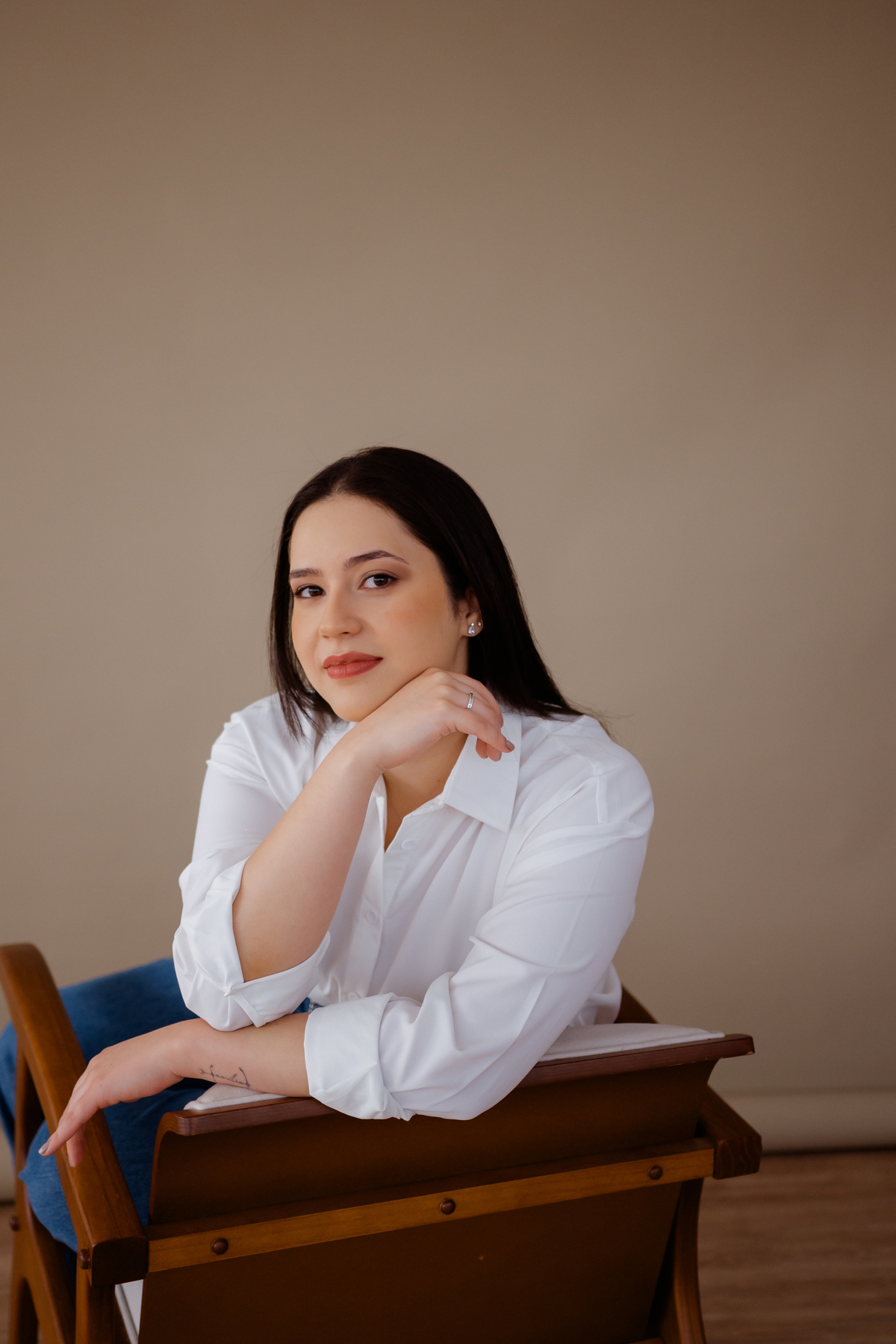 Vivian é super jovem e está se formando em psicologia. Dedicada, estudiosa e preocupada em transmitir profissionalismo e segurança, mesmo sendo tão madura, a jovialidade, se não for trabalhada corretamente, não atinge o público que precisa. Equilibramos sua imagem nas roupas, expressão corporal e cabelo. Repare como o cabelo para atrás dos ombros, transmite uma imagem mais madura e séria, equilibrada com a formalidade da camisa, conseguimos ter a seriedade e confiança nessas imagens. Por outro lado, a leveza e a profundidade fazem parte da sua marca pessoal e profissão.