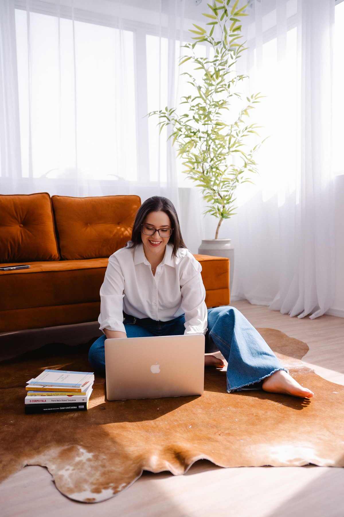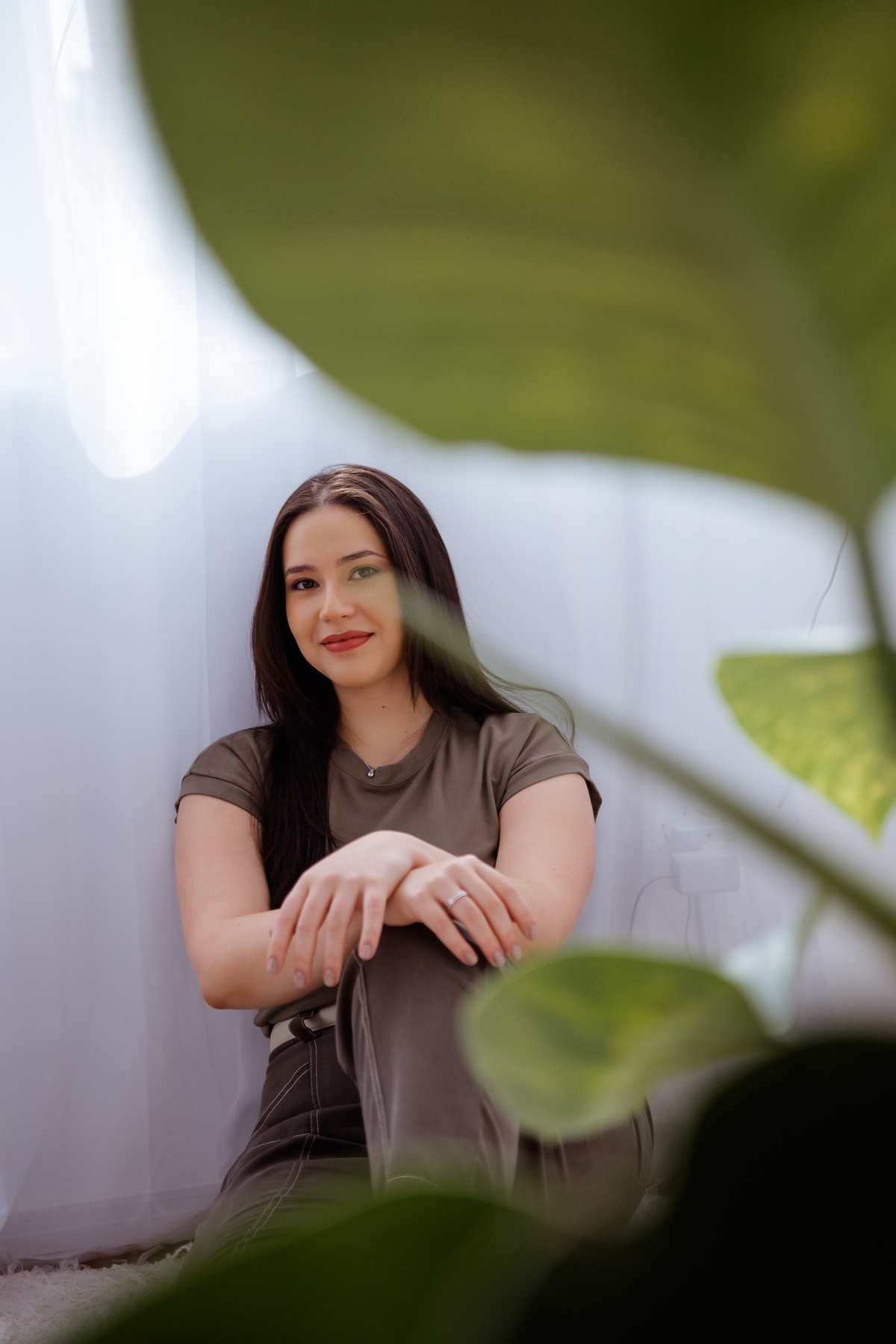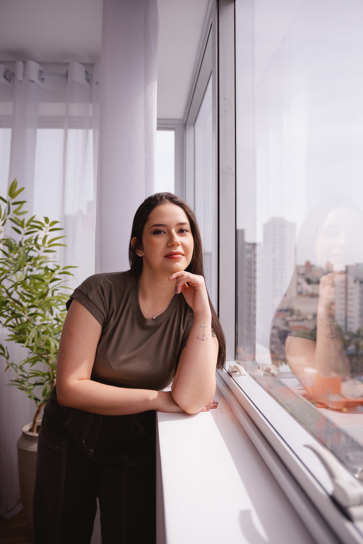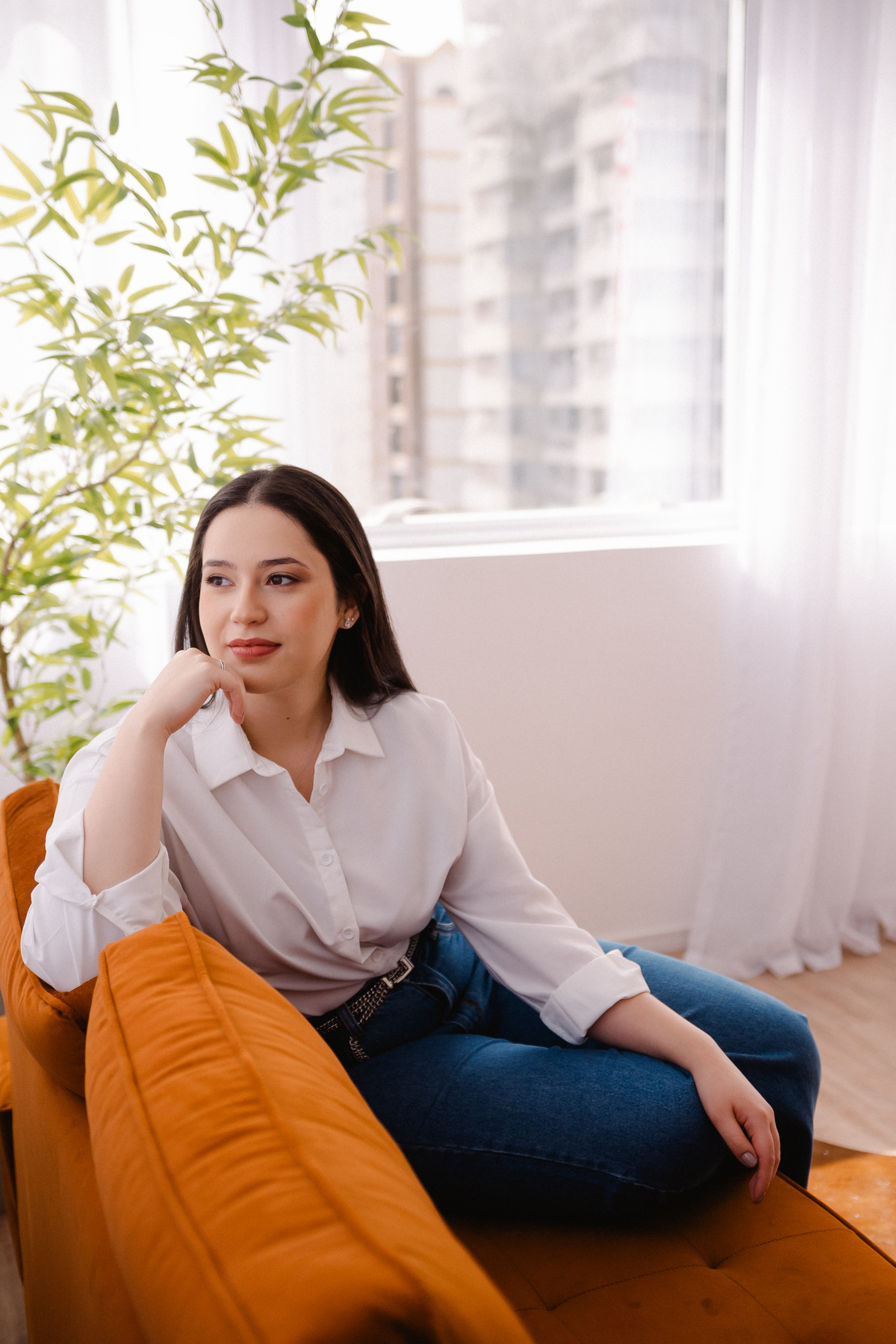 Vivian é super jovem e está se formando em psicologia. Dedicada, estudiosa e preocupada em transmitir profissionalismo e segurança, mesmo sendo tão madura, a jovialidade, se não for trabalhada corretamente, não atinge o público que precisa. Equilibramos sua imagem nas roupas, expressão corporal e cabelo. Repare como o cabelo para atrás dos ombros, transmite uma imagem mais madura e séria, equilibrada com a formalidade da camisa, conseguimos ter a seriedade e confiança nessas imagens. Por outro lado, a leveza e a profundidade fazem parte da sua marca pessoal e profissão.